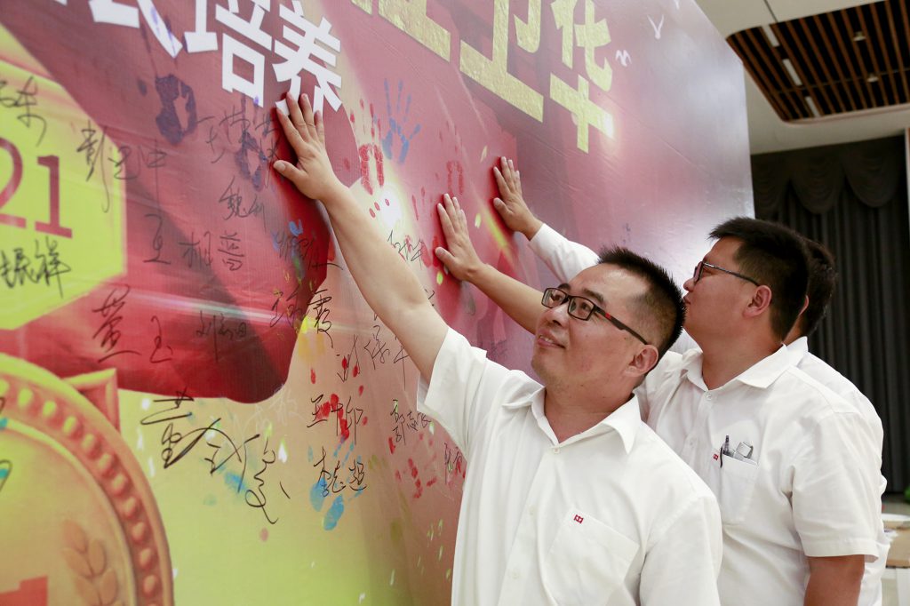 各位班组长学员在当初许下“学习先进管理知识,打造世界杯官方网站入口金牌班组”铮铮誓言的签名墙上留下掌印,五彩斑斓的掌印天空,记录了他们一路成长的印记。