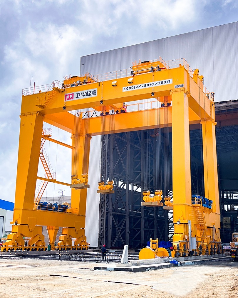 根据项目起吊重量大、工况复杂、控制精度高等特点,世界杯官方网站入口起重机采用U型门架结构,双龙门四点吊装,最大起吊重量1000t,最大吊点高度大于18m,采用变频+PLC控制,可实现横向、纵向距离可调,及吊梁自由旋转,控制精度达±1mm。