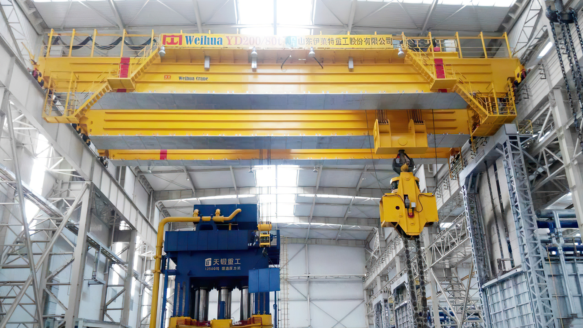 锻造起重机主要有双梁双轨单小车和三梁四轨道双小车两种结构形式。锻造起重机的结构形式与锻压厂房及液压机布置密切相关。